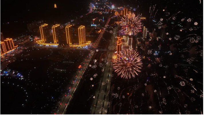璀璨绚烂的烟花与城市的夜景、群众的欢声笑语交相辉映。不同色彩、不同造型、不同声响的焰火组成诗的意境、花的海洋、美的赞歌,一张张笑脸上写满幸福和喜悦。大家纷纷举起手机记录美丽时刻,在五光十色的焰火中憧憬新年新气象,在欢歌笑语中礼赞新时代。